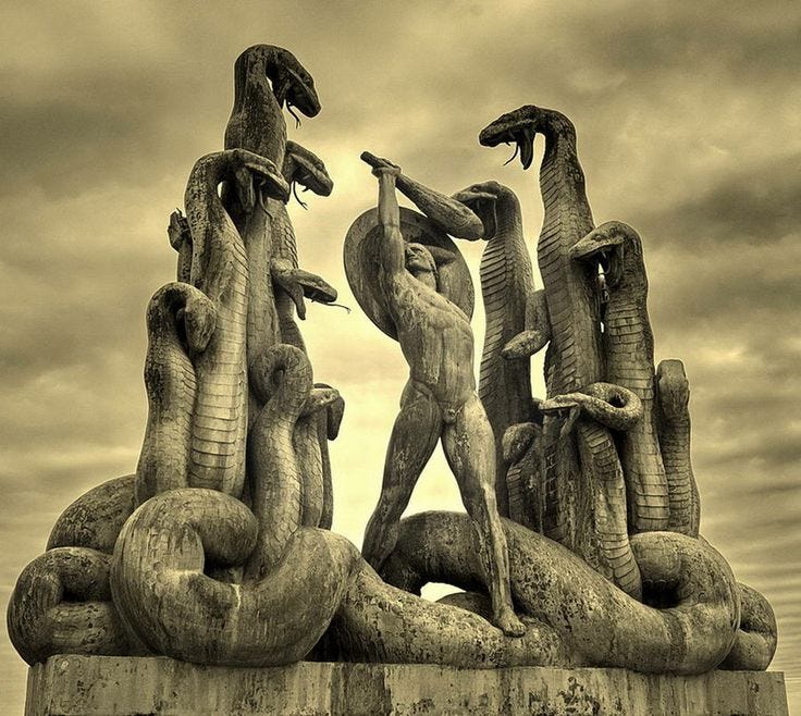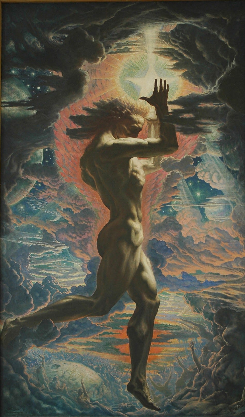 My Heart Laid Bare is the phrase used for his diary by Charles Baudelaire, godfather of the discontents of Modernism and patron saint of the Decadent Movement (1880-1914). But it is not just the heart that must be laid bare for a way out of the decadence to take place. There must be a “radical destruction of the bourgeois,” as Evola put it, in the consciousness of you as Modern man. You must burn your old self with the fire of Prometheus — as in this 1907 work by the Belgian visionary Jean Delville — to be reborn, phoenix-like, from the ashes, prepared to confront the multi-headed Hydra of Western decadence.