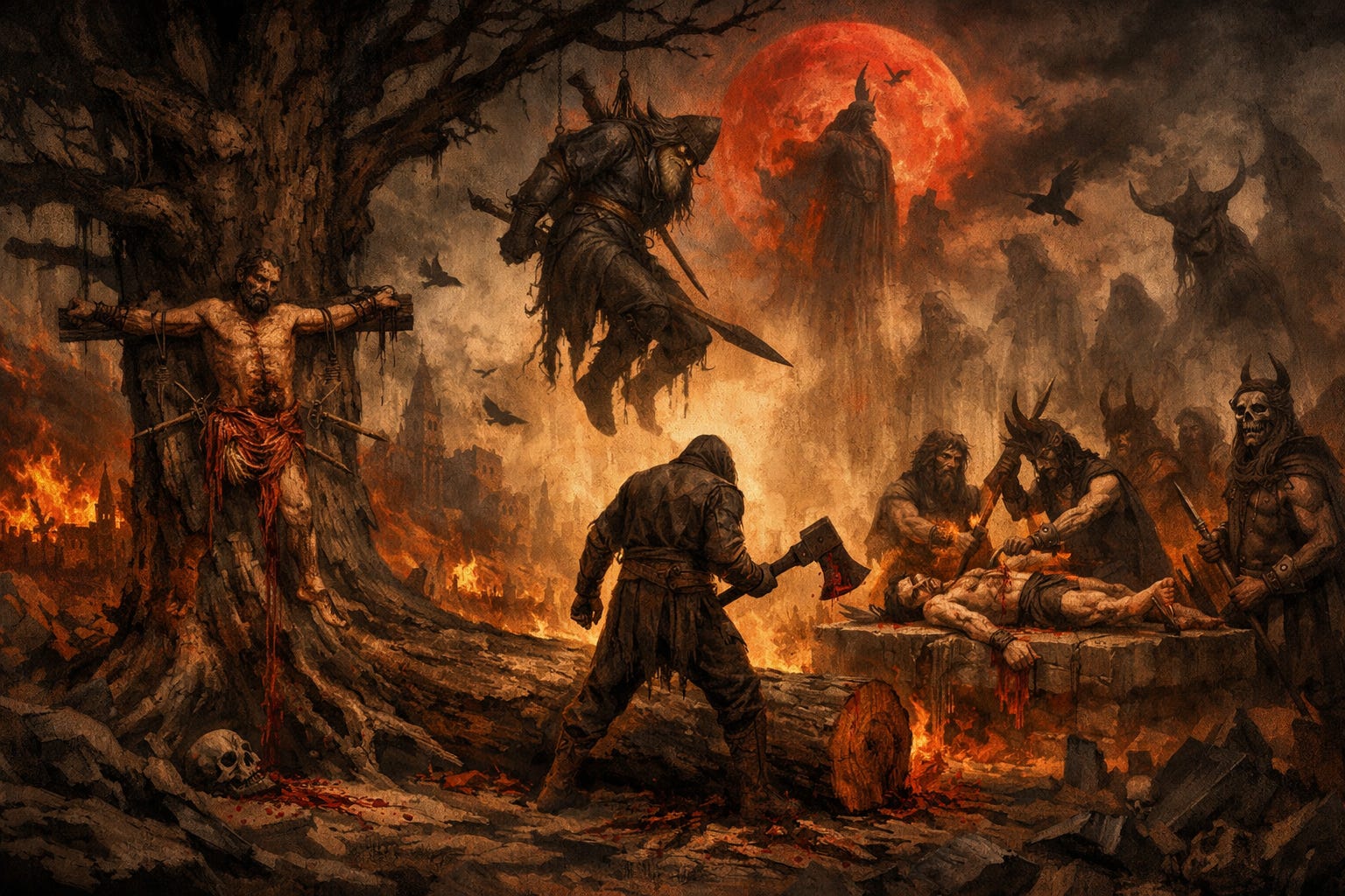 For tearing the bark from sacred trees in the primeval forests, Germanic tribes proscribed a penalty of disembowelment for the captured offender, whose entrails would be nailed to the wounded flesh of the oak and they would be forced to walk around the tree until they perished.