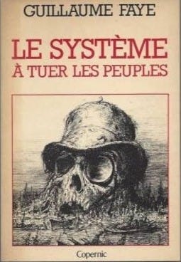 This speech would be expanded upon and evolve into one of the most important works ever written by Guillaume Faye, his (first) magnum opus, Le Système à tuer les peuples. The latter book is extremely rare, difficult to find, and has remained untranslated… until now: