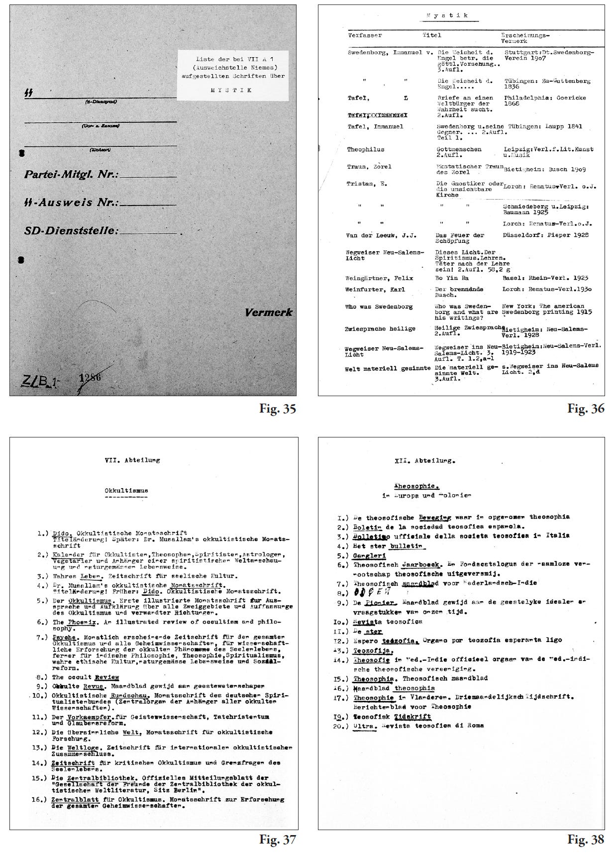 In short, it was a cultural institution that frequently touched on ‘frontier’ topics. There were sub-departments dedicated to Freemasonry (VII B1), ecclesiastical politics (VII B2), and churches (VII B3). Also related to Freemasonry are the archive (VII C1) and the museum (VII C2), which Evola may have visited in the late 1930s. Department VII C3, directed by Rudolf Levin, was dedicated to witchcraft, magic, and popular superstitions, linked to Sonderauftrag H (Hexen, ‘witches’). Twenty specialists studied the records of ‘witch trials’ in Germany and Austria, along with documents from private libraries and archives (17th-18th centuries), often working in collaboration with the Ahnenerbe, with the aim of compiling a monumental Bibliography of Witchcraft, a project which remained only at the embryonic stage.